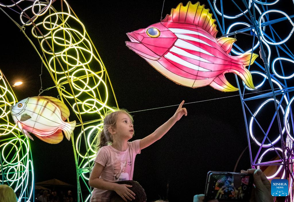 A girl visits the Chinese Lantern Exhibition in Tel Aviv, Israel, on Aug. 9, 2023. The Chinese Lantern Exhibition in Tel Aviv features several sets of lanterns which are crafted by a team from Zigong City of southwest China's Sichuan Province. (Xinhua/Chen Junqing)