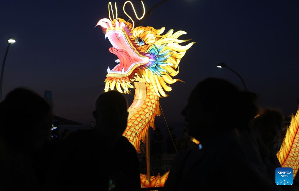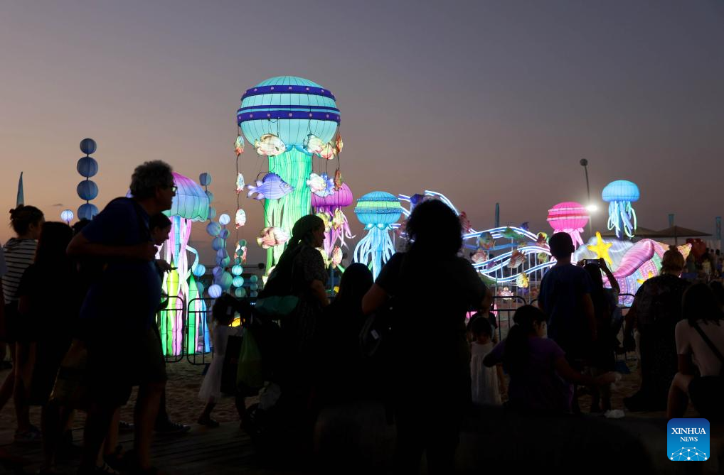 People visit the Chinese Lantern Exhibition in Tel Aviv, Israel, on Aug. 9, 2023. The Chinese Lantern Exhibition in Tel Aviv features several sets of lanterns which are crafted by a team from Zigong City of southwest China's Sichuan Province. (Xinhua/Chen Junqing)