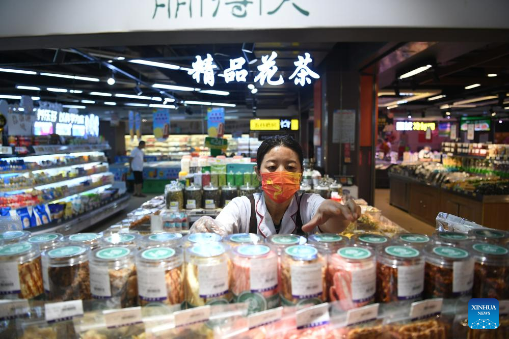 A citizen shops at a supermarket in Zhuozhou, north China's Hebei Province, Aug. 10, 2023. Some markets, supermarkets and shopping malls have been returned to normal operation after the floodwater receded in Zhuozhou. At present, the supply of daily necessities in the city has been adequate with stable price. (Xinhua/Zhu Xudong)