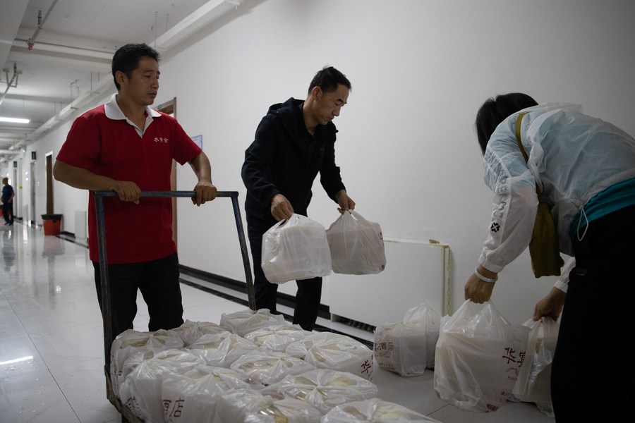 Staff members carry breakfast at a temporary shelter in Shidai middle school in Wuchang, northeast China's Heilongjiang Province, Aug. 10, 2023. Wuchang City has been severely affected by rain-triggered floods. (Xinhua/Zhang Tao)