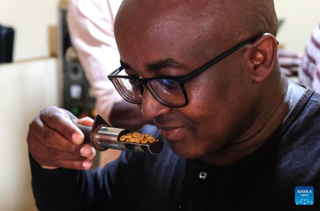 Gerald Katabazi, a Ugandan coffee businessman, checks on a batch of freshly roasted coffee beans at his coffee roastery in Kampala, Uganda on Aug. 7, 2023. (Photo by Hajarah Nalwadda/Xinhua)