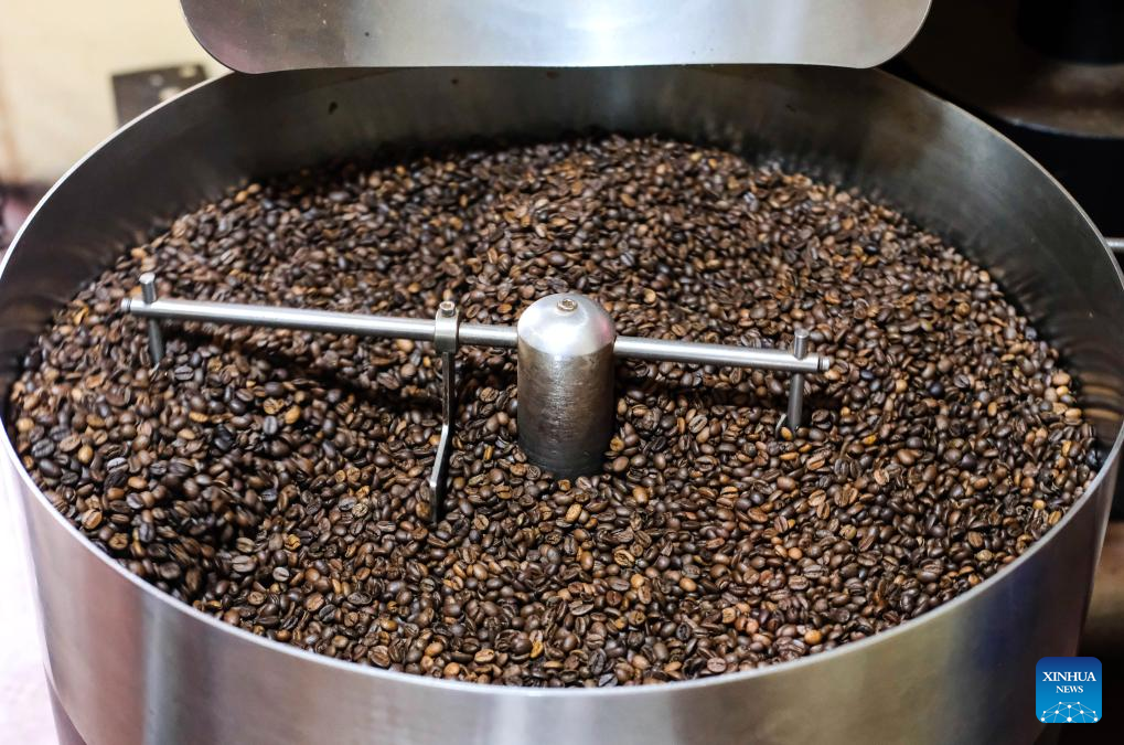 This photo taken on Aug. 7, 2023 shows coffee beans in roasting process at a local coffee roastery created by Gerald Katabazi in Kampala, Uganda. (Photo by Hajarah Nalwadda/Xinhua)