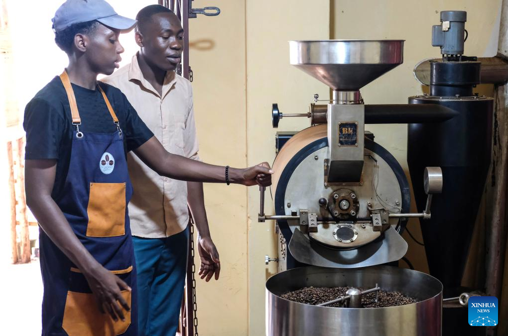 Workers roast coffee beans with a machine at the coffee roastery created by Gerald Katabazi in Kampala, Uganda on Aug. 7, 2023. (Photo by Hajarah Nalwadda/Xinhua)