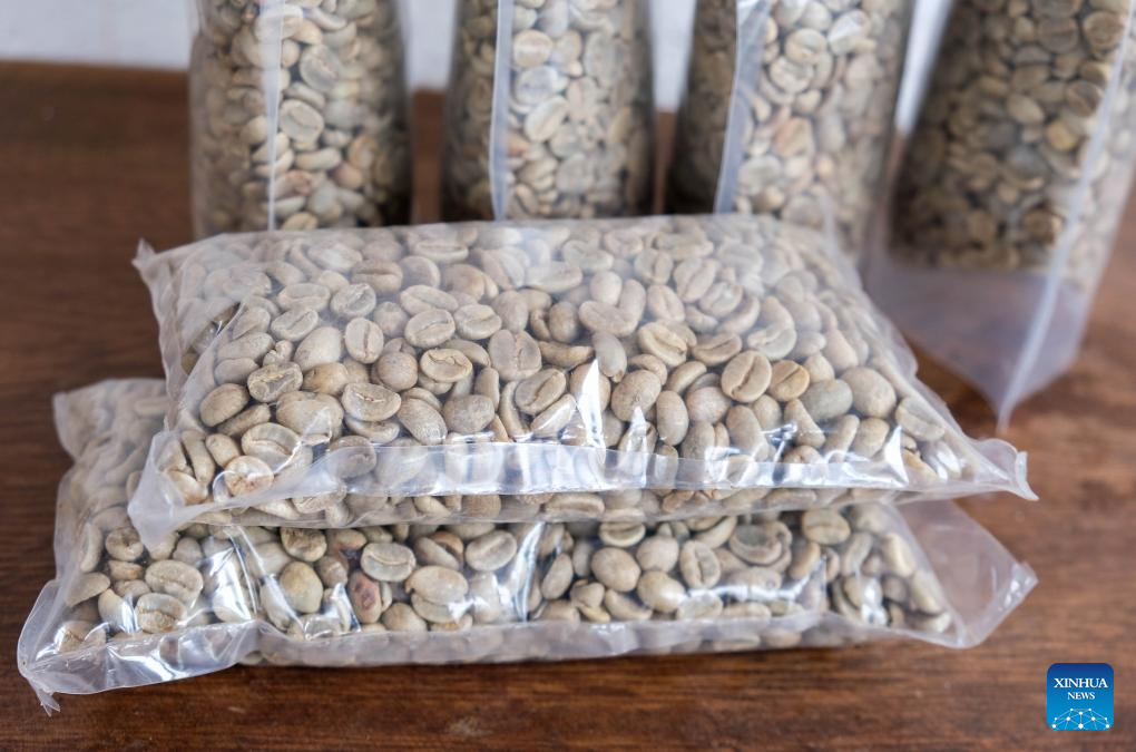 This photo taken on Aug. 7, 2023 shows samples of raw coffee beans at a local coffee roastery created by Gerald Katabazi in Kampala, Uganda. (Photo by Hajarah Nalwadda/Xinhua)