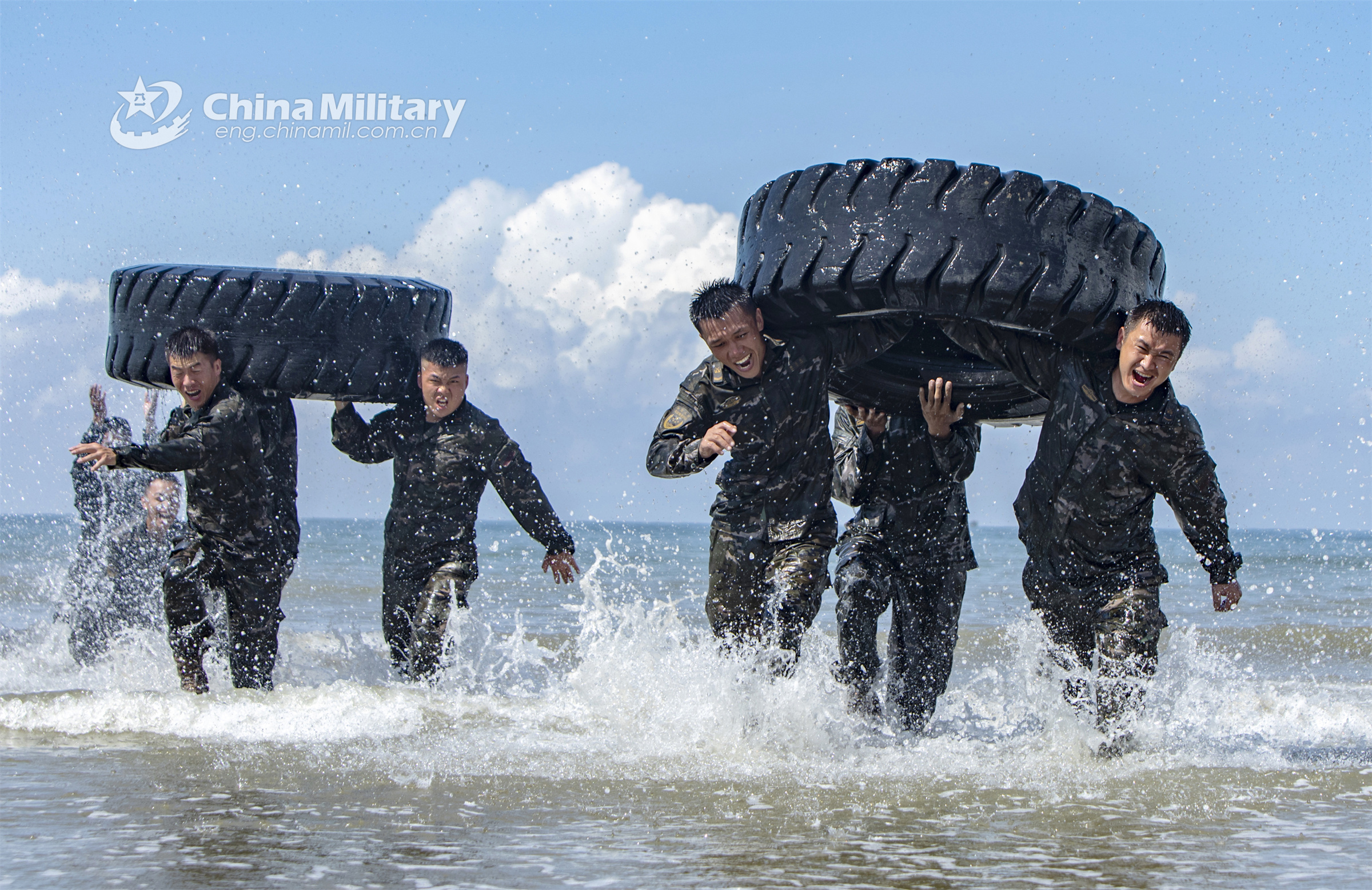 Soldiers assigned to a detachment of the Chinese PAP Guangxi Corps shoulder 100-kilogram tires during a physical fitness training exercise in early August. (eng.chinamil.com.cn/Photo by Yu Haiyang)