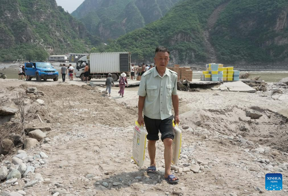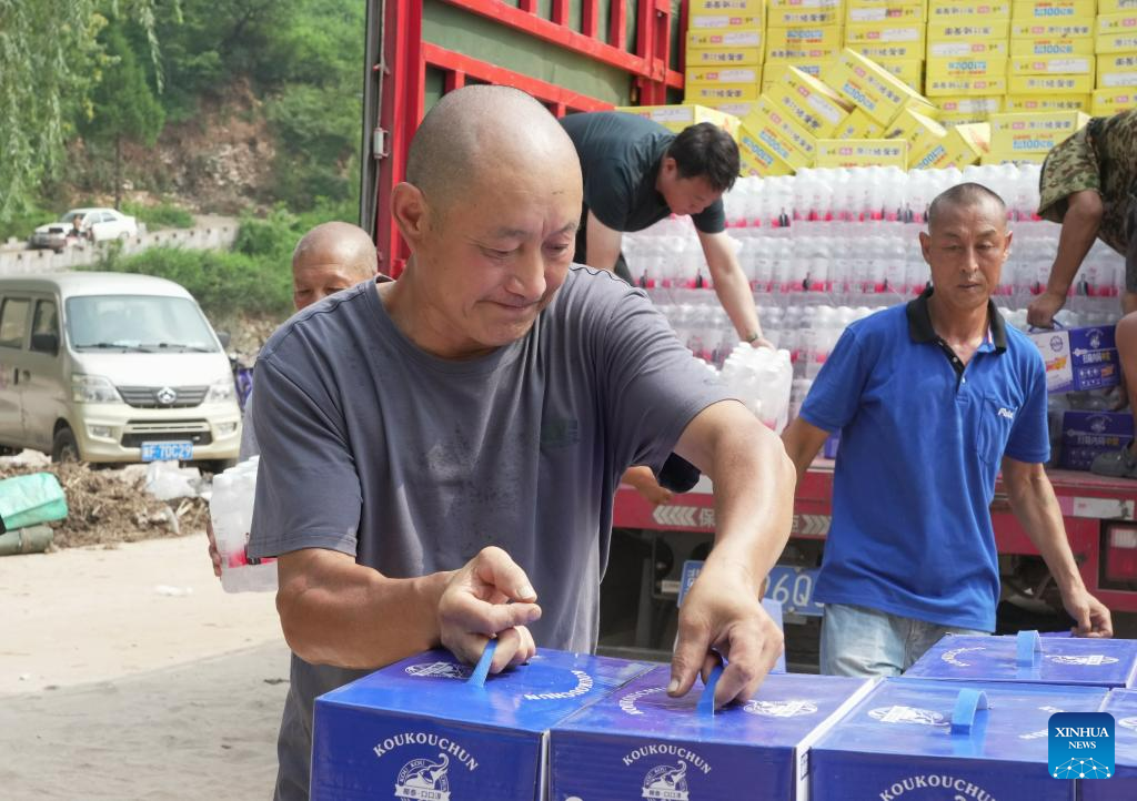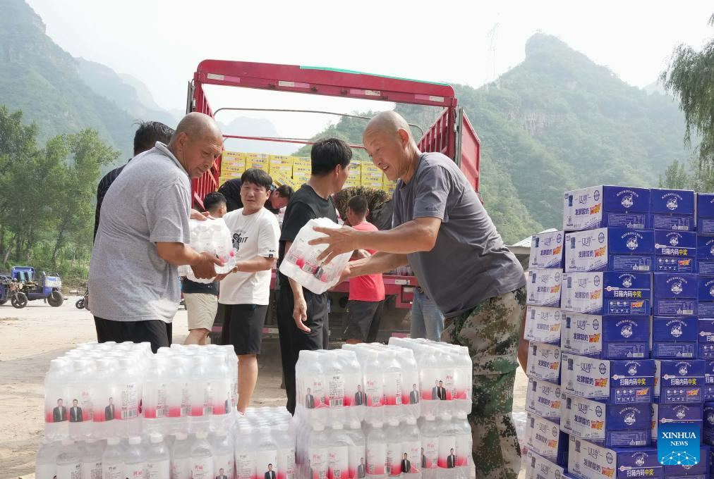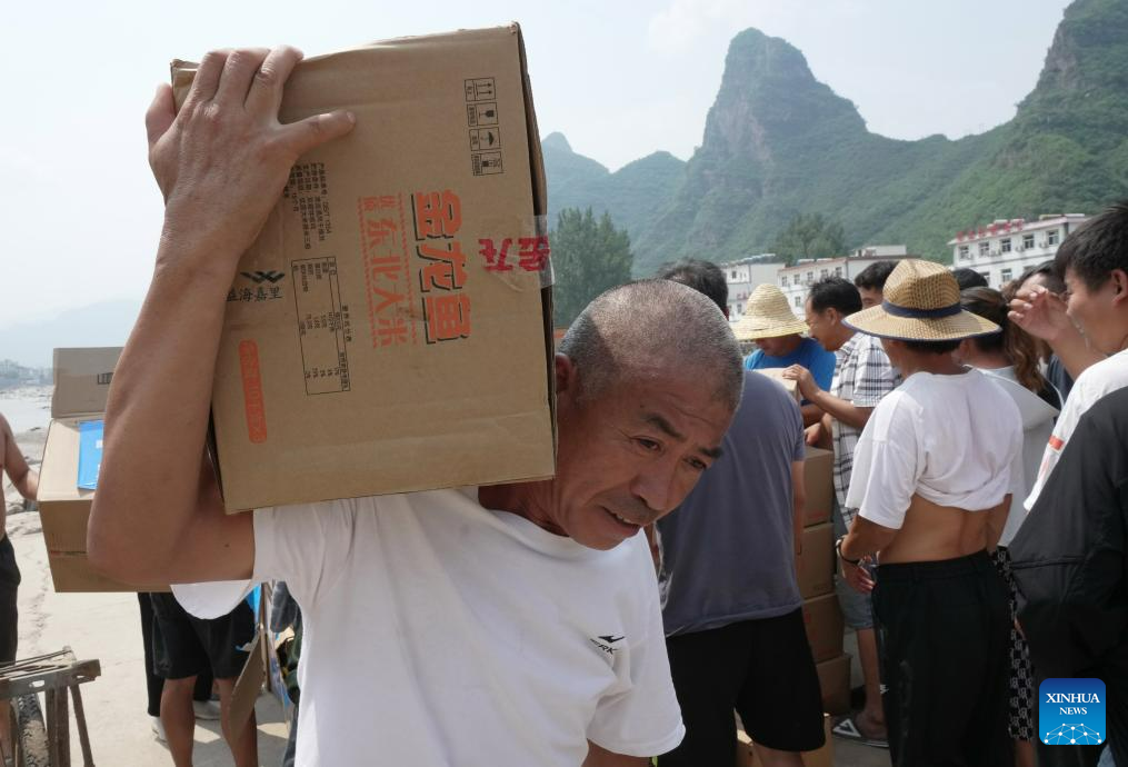 Villagers unload food and bottled water from a truck in Longmen Township of Laishui County, north China's Hebei Province, Aug. 10, 2023. Affected by heavy rainfall, some villages in Laishui County encountered traffic and communication disruptions. Local authorities have made every effort in mending infrastructure damaged by flood while delivering disaster relief supplies purchased by the government and donated by all walks of life to flood-affected residents. (Xinhua/Yang Shiyao)