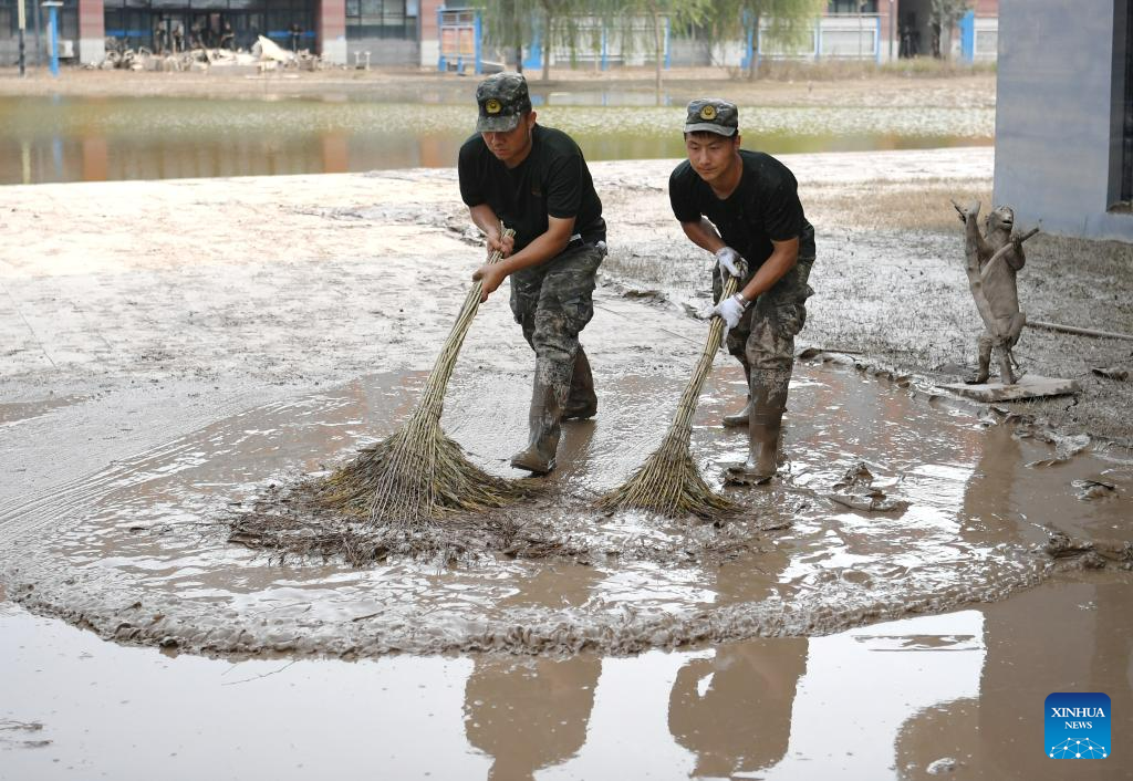 Members of the armed police force clean up sludge left after the flood caused by rainstorms brought by Typhoon Doksuri at a high school in Zhuozhou, north China's Hebei Province, Aug. 10, 2023. (Xinhua/Zhu Xudong)