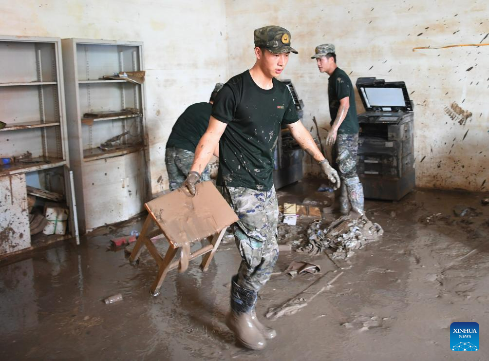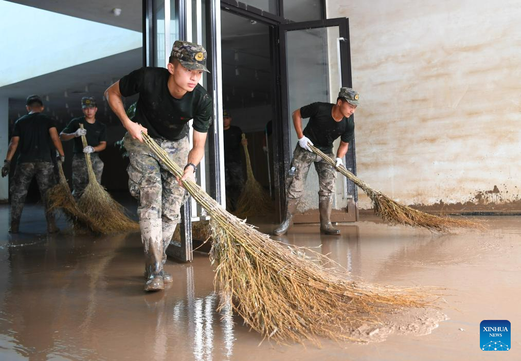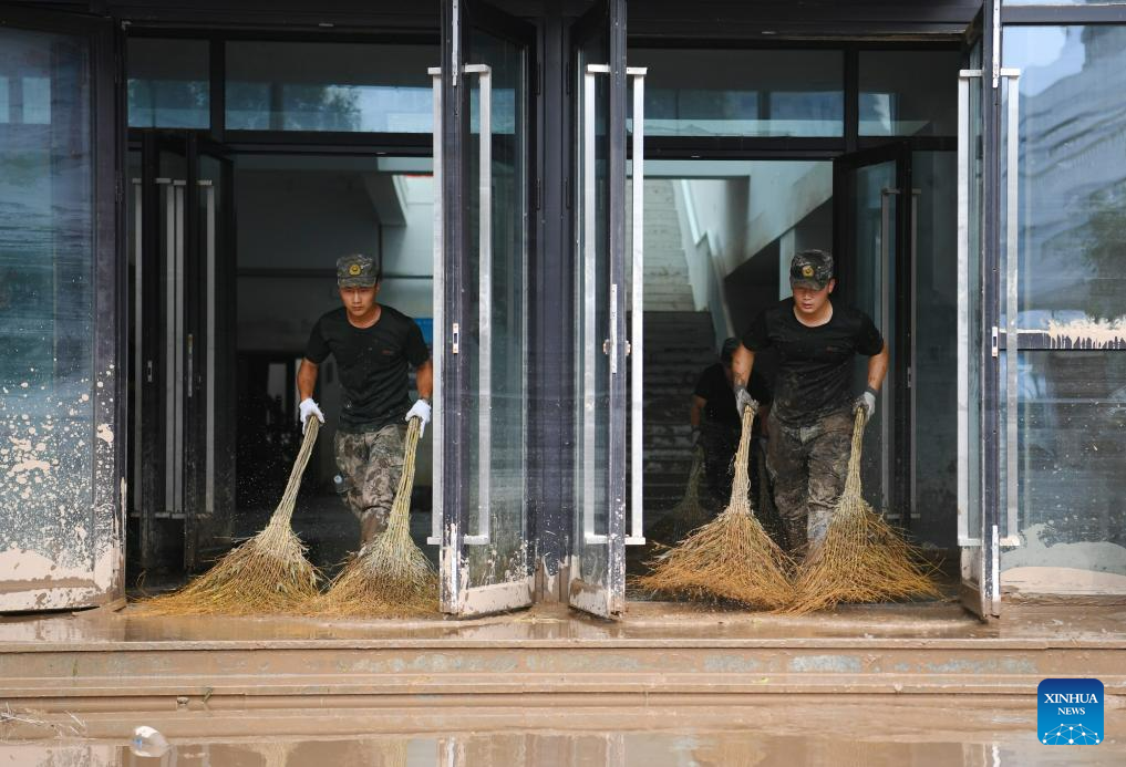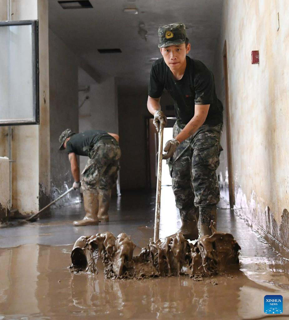 Members of the armed police force clean up garbage left after the flood caused by rainstorms brought by Typhoon Doksuri at the teaching building of a high school in Zhuozhou, north China's Hebei Province, Aug. 10, 2023. (Xinhua/Zhu Xudong)