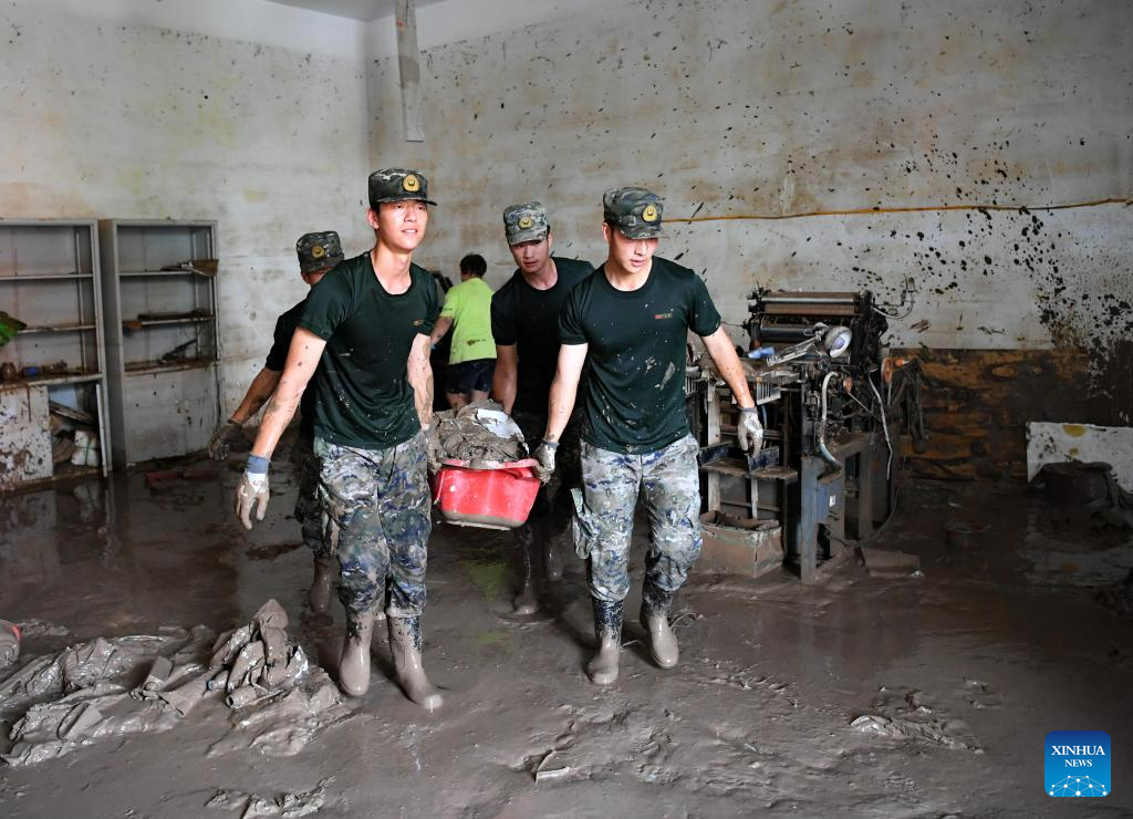 Members of the armed police force clean up sludge left after the flood caused by rainstorms brought by Typhoon Doksuri at the teaching building of a high school in Zhuozhou, north China's Hebei Province, Aug. 10, 2023. (Xinhua/Zhu Xudong)