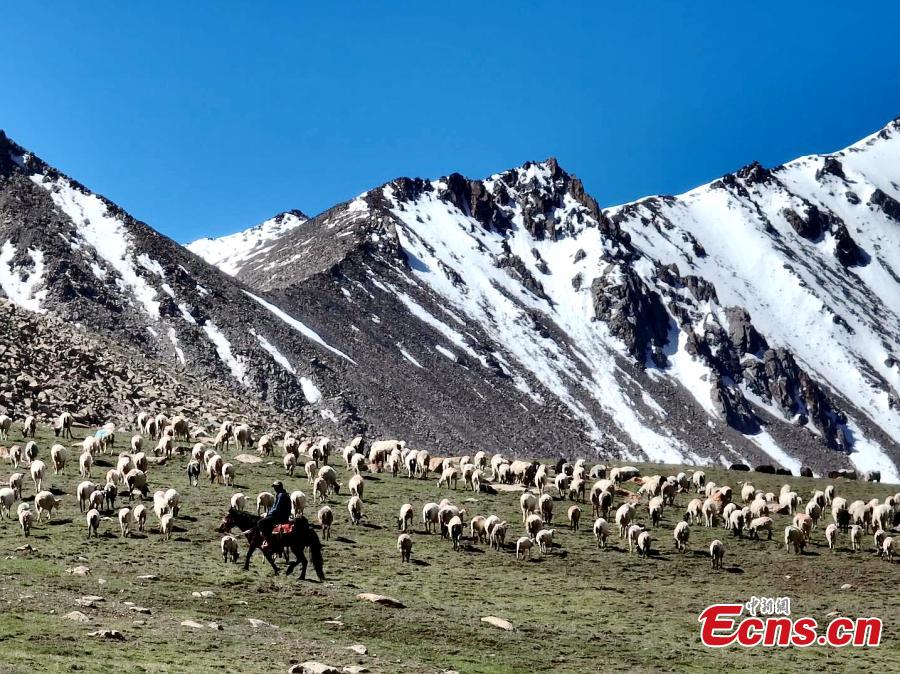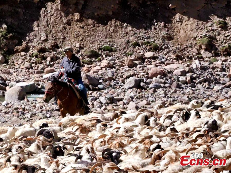 A herder drives livestock on the way to summer pasture in Dulan County of Haixi Mongolian-Tibetan Autonomous Prefecture, northwest China's Qinghai Province. (Photo: China News Service/Mo Jiayin)