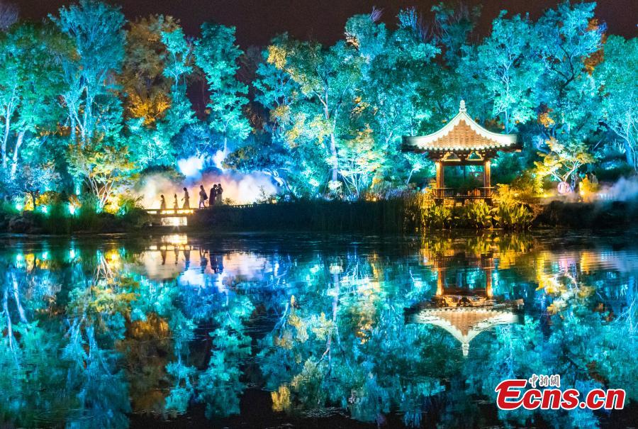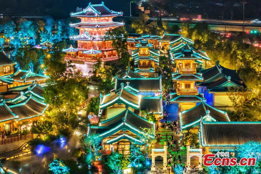 Illuminated Yanjili ancient town reproduces the grandeur of a capital of six dynasties in Nanjing, east China's Jiangsu Province, Aug. 10, 2023. (Photo: China News Service/Yang Bo)