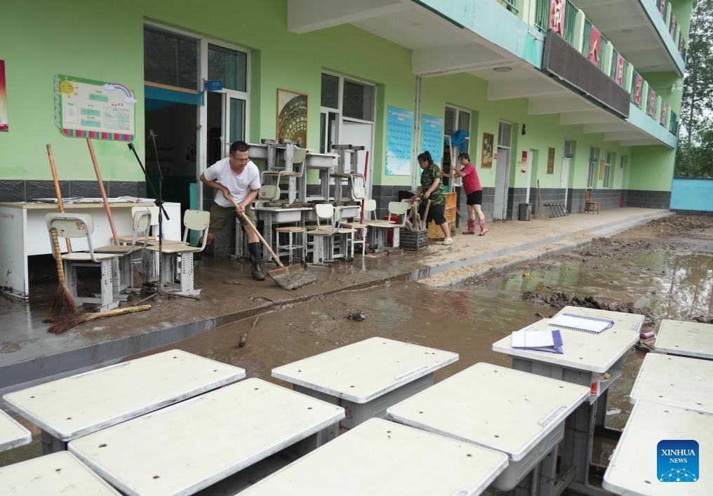 Teachers clean up sludge at a school in Qizhongkou Town of Laishui County, north China's Hebei Province, Aug. 11, 2023. Some schools, located in the mountainous areas of Laishui County, have carried out post-flood recovery work recently. Relevant personnel have investigated schools thoroughly for potential safety hazards, cleaned campuses and carried out disinfection for epidemic prevention and control. (Xinhua/Wang Kun)