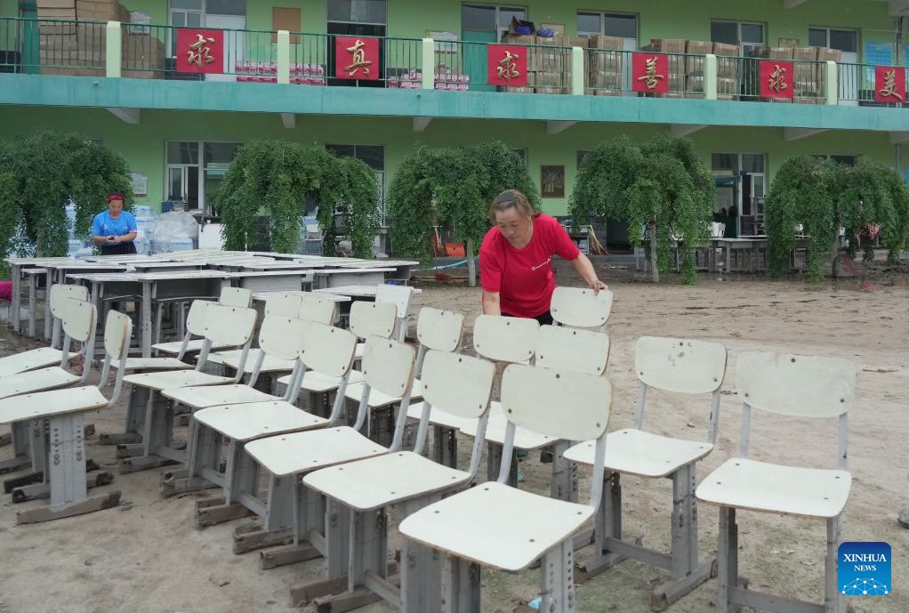 Teachers clean desks at a school in Qizhongkou Town of Laishui County, north China's Hebei Province, Aug. 11, 2023. Some schools, located in the mountainous areas of Laishui County, have carried out post-flood recovery work recently. Relevant personnel have investigated schools thoroughly for potential safety hazards, cleaned campuses and carried out disinfection for epidemic prevention and control. (Xinhua/Yang Shiyao)