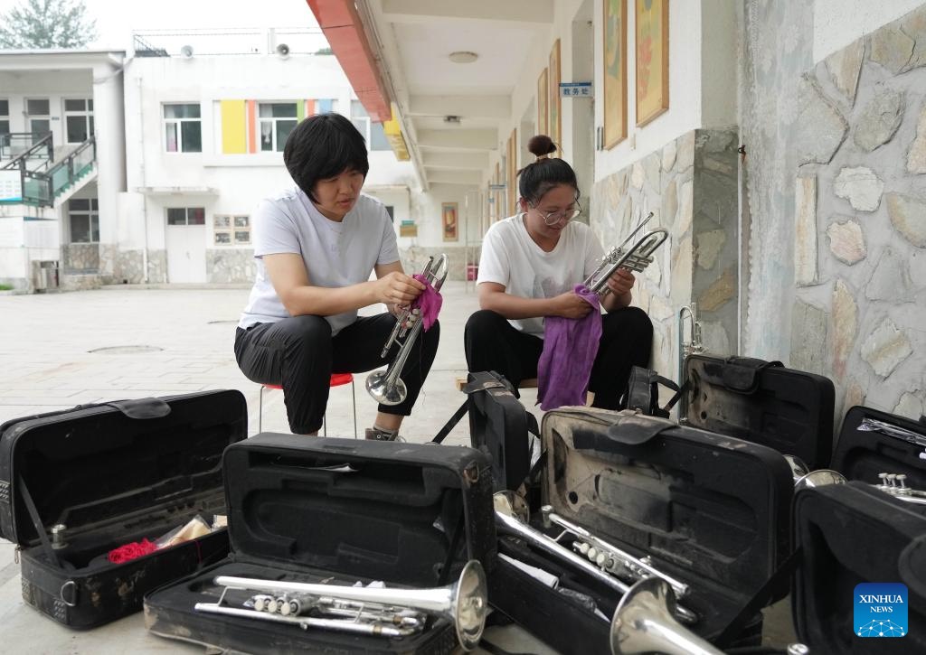 Teachers clean musical instruments at a school in Longmen Village of Laishui County, north China's Hebei Province, Aug. 11, 2023. Some schools, located in the mountainous areas of Laishui County, have carried out post-flood recovery work recently. Relevant personnel have investigated schools thoroughly for potential safety hazards, cleaned campuses and carried out disinfection for epidemic prevention and control. (Xinhua/Yang Shiyao)