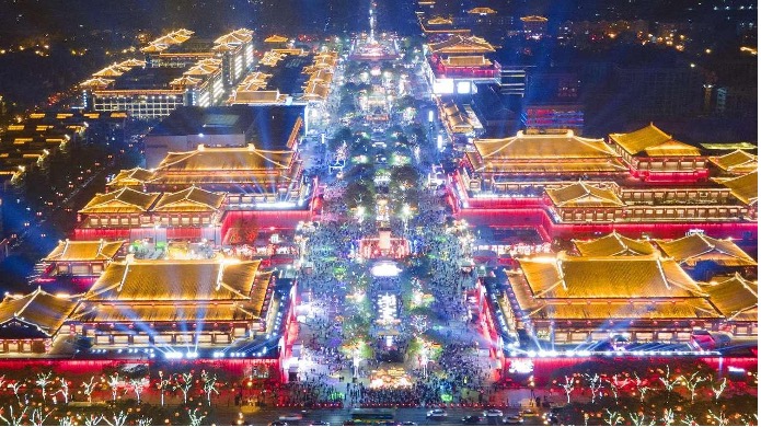 Datang Everbright City scenic area, a tourist landmark of Xi'an, Shaanxi province featuring a grand street with characteristics of the Tang Dynasty, launched an augmented reality (AR) project this year, which enables tourists to see virtual objects in the real-world environment and thus offers them an immersive experience.