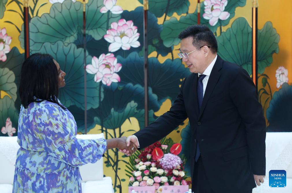 President of Xinhua News Agency Fu Hua meets with Daisy Veerasingham, president and CEO of the Associated Press (AP), in Beijing, capital of China, Aug. 13, 2023. (Xinhua/Ju Peng)