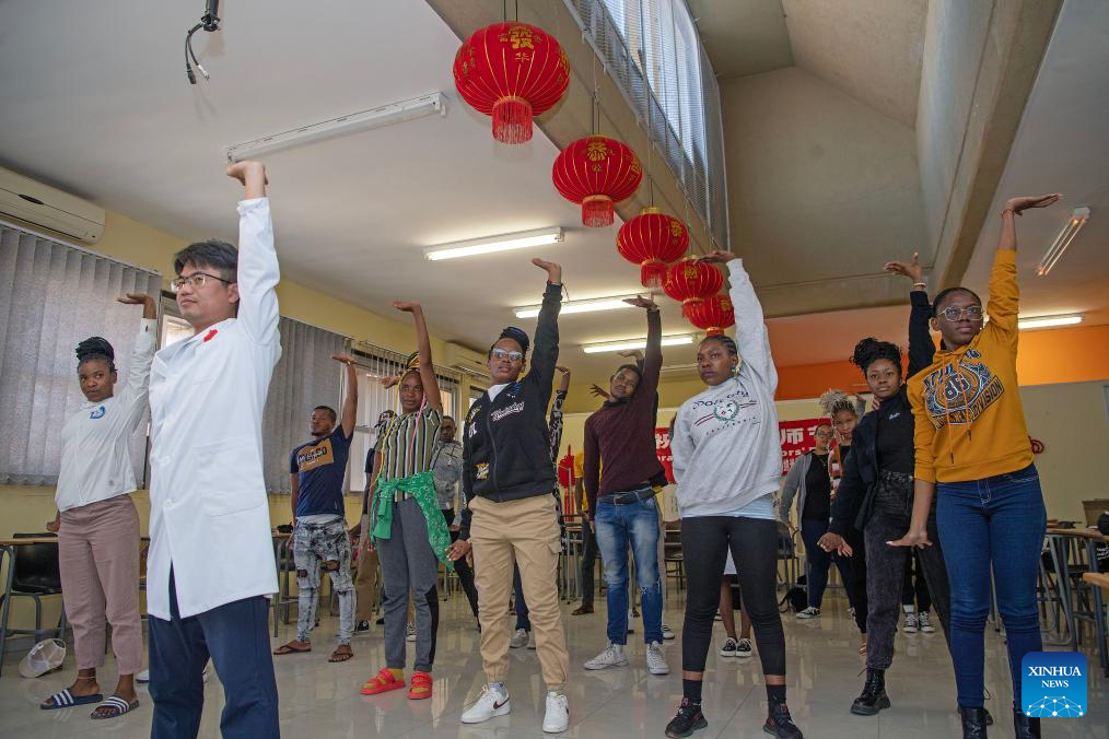 Students practice Baduanjin Qigong during a traditional Chinese medicine lecture at the University of Namibia in Windhoek, Namibia, on Aug. 14, 2023. The Chinese medical team in Namibia on Monday delivered a lecture on traditional Chinese medicine (TCM) to students from the University of Namibia, enabling them to have a better understanding of the TCM techniques. (Xinhua/Chen Cheng)