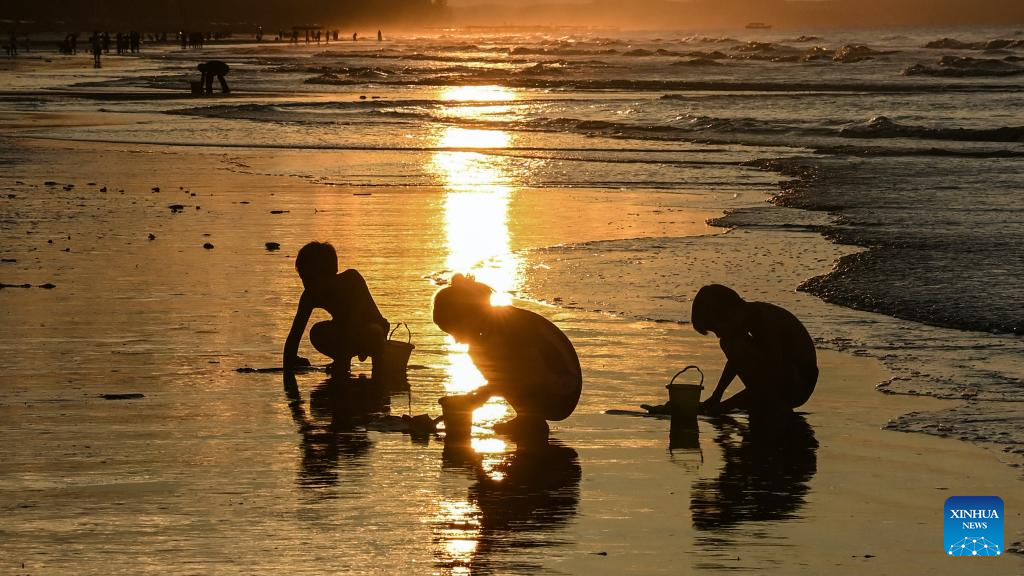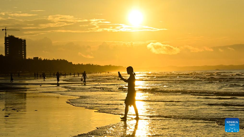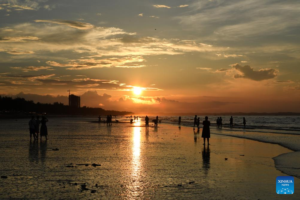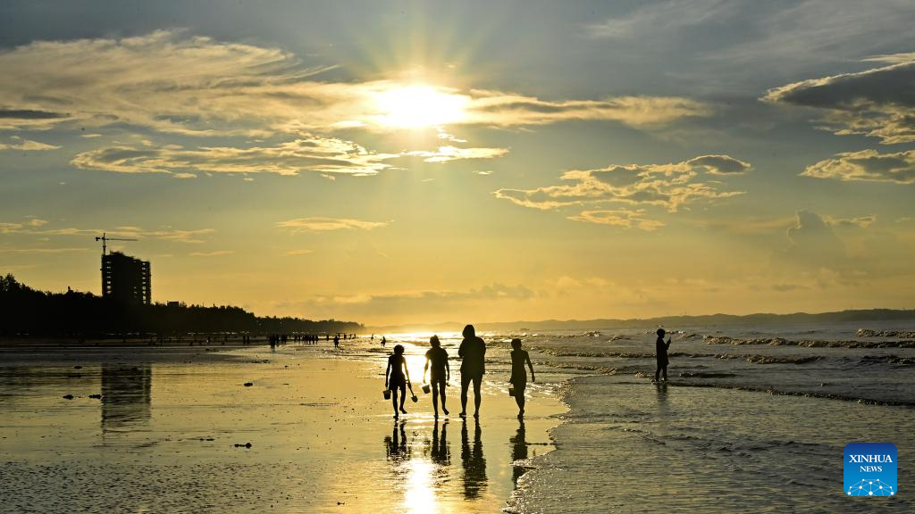 Tourists have fun in the sunrise at Jintan beach in Dongxing, south China's Guangxi Zhuang Autonomous Region, Aug. 14, 2023. Jintan beach, which is located in the southern part of the Wanwei Island, has a coastline of 15 kilometers and is named after its golden sand color. (Xinhua/Zhou Hua)