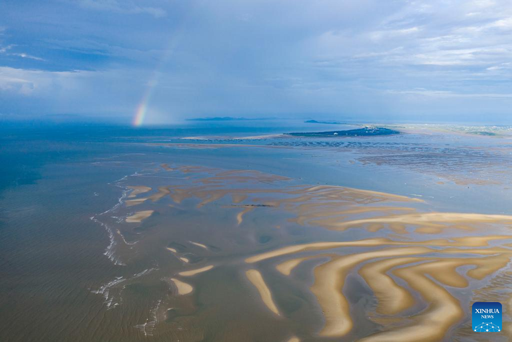 This aerial photo taken on Aug. 14, 2023 shows a rainbow in the sky at Jintan beach in Dongxing, south China's Guangxi Zhuang Autonomous Region. Jintan beach, which is located in the southern part of the Wanwei Island, has a coastline of 15 kilometers and is named after its golden sand color. (Xinhua/Yang Zhisen)