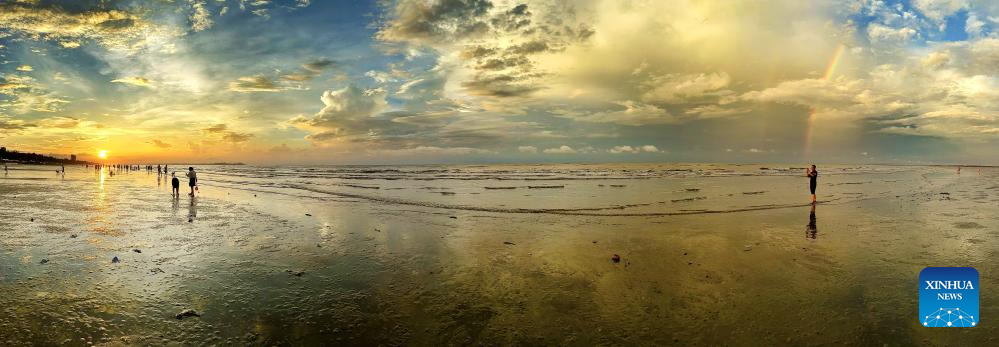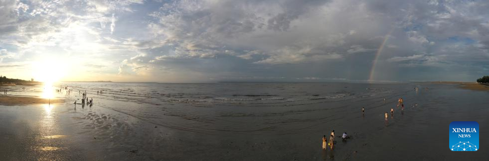 Tourists have fun as a rainbow appears in the sky at Jintan beach in Dongxing, south China's Guangxi Zhuang Autonomous Region, Aug. 14, 2023. Jintan beach, which is located in the southern part of the Wanwei Island, has a coastline of 15 kilometers and is named after its golden sand color. (Xinhua/Zhang Ailin)