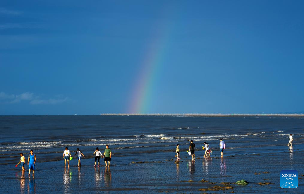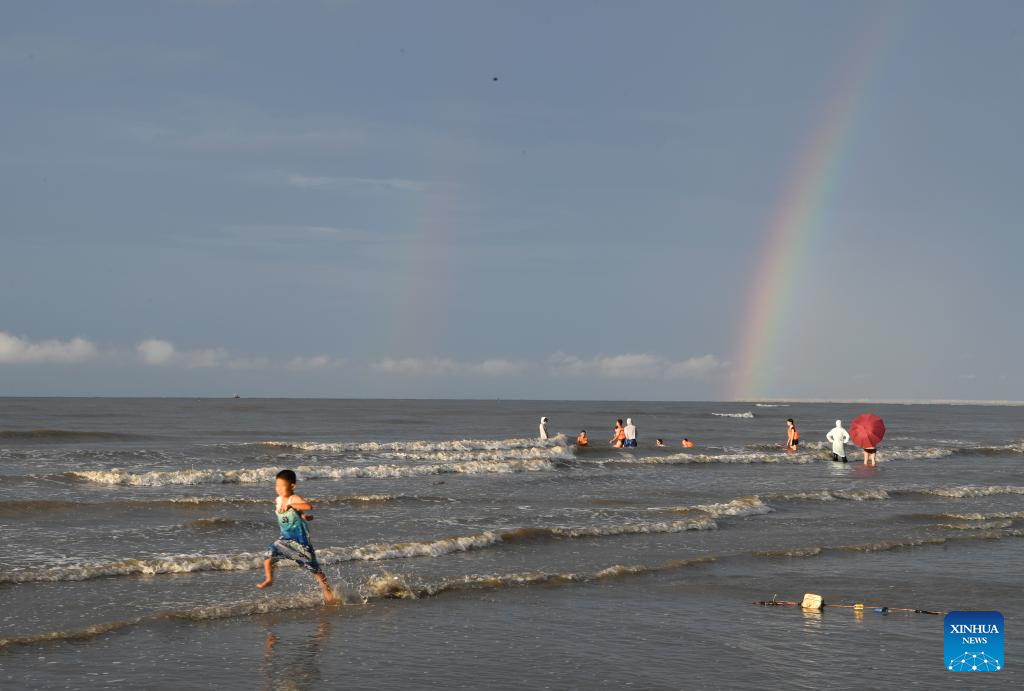 Tourists have fun as a rainbow appears in the sky at Jintan beach in Dongxing, south China's Guangxi Zhuang Autonomous Region, Aug. 14, 2023. Jintan beach, which is located in the southern part of the Wanwei Island, has a coastline of 15 kilometers and is named after its golden sand color. (Xinhua/Fei Maohua)