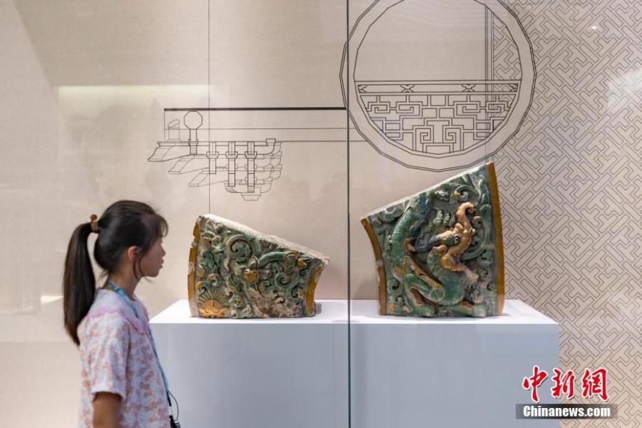 A girl views dragon pattern colored glaze bricks of the Ming Dynasty (1368-1644) displayed in a museum at the Grand Baoen Temple Heritage and Scenic Area in Nanjing, east China's Jiangsu Province, Aug. 14, 2023. (Photo: China News Service/Yang Bo)