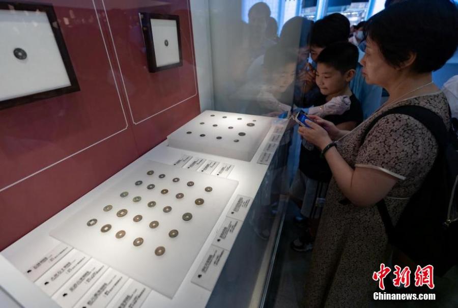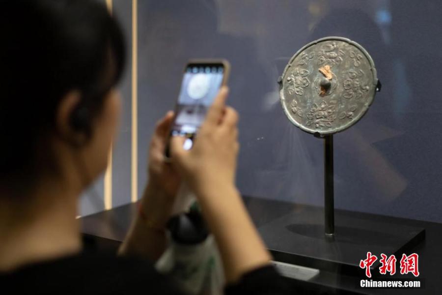 A visitor takes photos of a bronze mirror of the Tang Dynasty (618-907) displayed in a museum at the Grand Baoen Temple Heritage and Scenic Area in Nanjing, east China's Jiangsu Province, Aug. 14, 2023. (Photo: China News Service/Yang Bo)