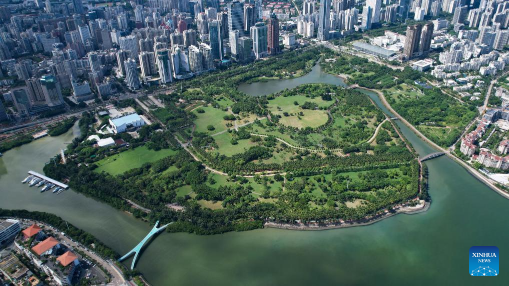 This aerial photo taken on Aug. 10, 2023 shows the Evergreen Park in Haikou, south China's Hainan Province. In recent years, Haikou has embarked on a green, sustainable and high-quality development journey via building wetland parks with ecological water conservancy projects, promoting the construction of beautiful bays and developing the modern environmental manage system. (Xinhua/Yang Guanyu)