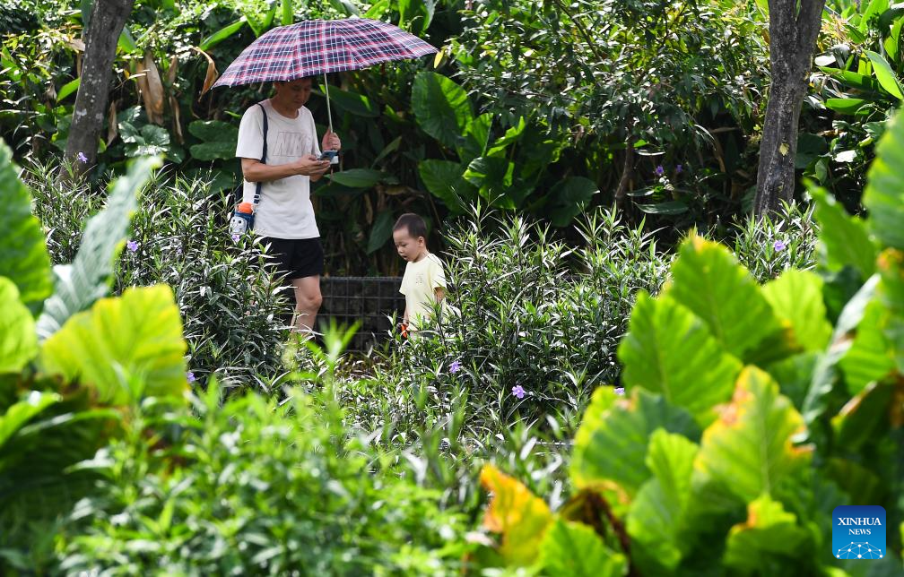 People visit Meishe River Fengxiang Wetland Park in Haikou, south China's Hainan Province, Aug. 2, 2023. In recent years, Haikou has embarked on a green, sustainable and high-quality development journey via building wetland parks with ecological water conservancy projects, promoting the construction of beautiful bays and developing the modern environmental manage system. (Xinhua/Yang Guanyu)
