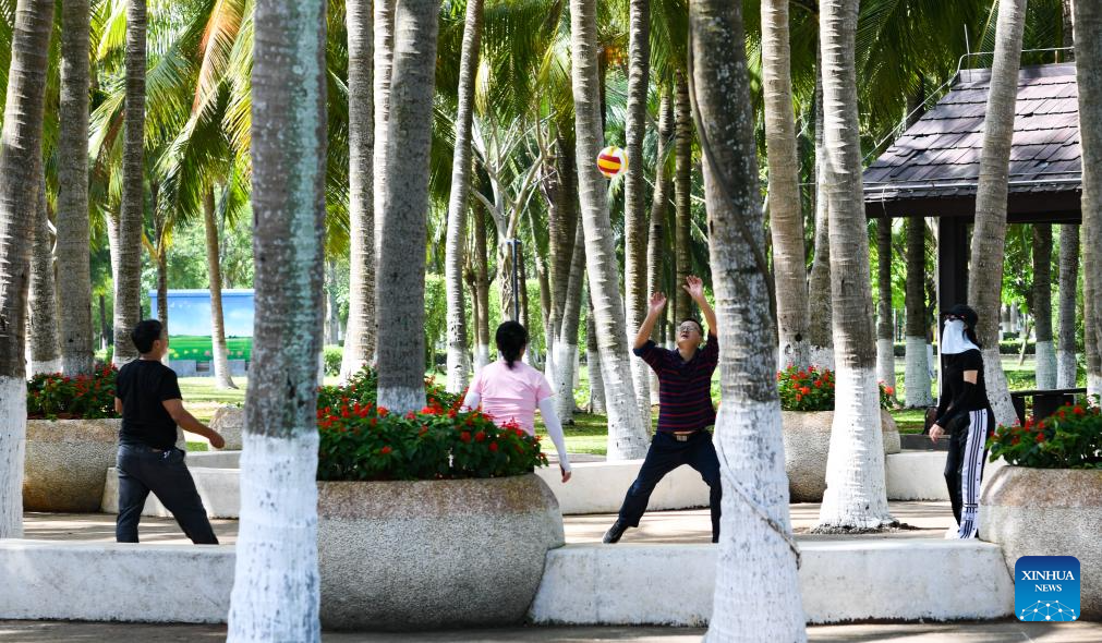 People play volleyball at the Evergreen Park in Haikou, south China's Hainan Province, April 5, 2022. In recent years, Haikou has embarked on a green, sustainable and high-quality development journey via building wetland parks with ecological water conservancy projects, promoting the construction of beautiful bays and developing the modern environmental manage system. (Xinhua/Yang Guanyu)