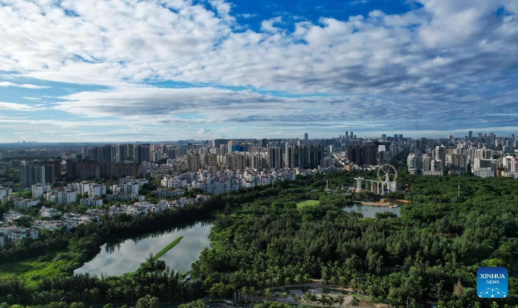 This aerial photo taken on Aug. 3, 2023 shows a view of Haikou, south China's Hainan Province. In recent years, Haikou has embarked on a green, sustainable and high-quality development journey via building wetland parks with ecological water conservancy projects, promoting the construction of beautiful bays and developing the modern environmental manage system. (Xinhua/Yang Guanyu)