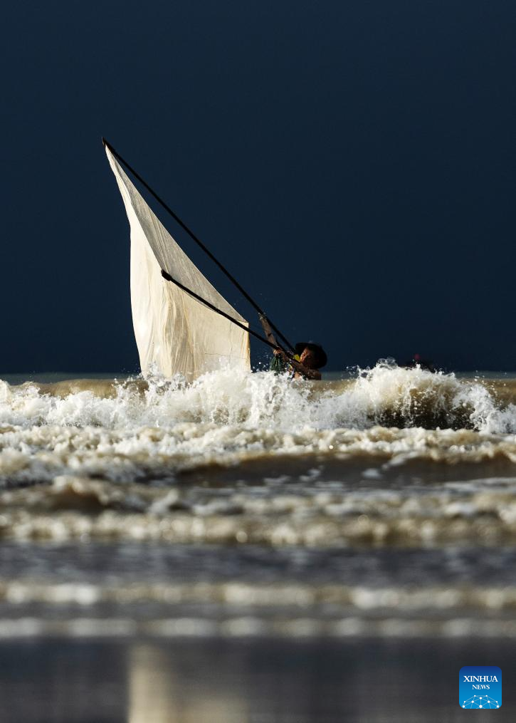 A fisherman in operation is seen at Jintan beach in Dongxing, south China's Guangxi Zhuang Autonomous Region, Aug. 15, 2023. Jintan beach, which is located in the southern part of the Wanwei Island, has a coastline of 15 kilometers and is named after its golden sand color. (Xinhua/Fei Maohua)