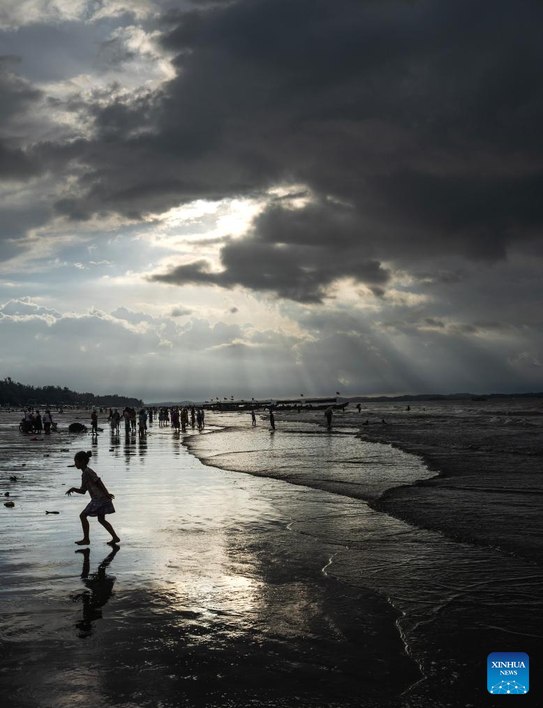 Tourists have fun at Jintan beach in Dongxing, south China's Guangxi Zhuang Autonomous Region, Aug. 15, 2023. Jintan beach, which is located in the southern part of the Wanwei Island, has a coastline of 15 kilometers and is named after its golden sand color. (Xinhua/Zhang Ailin)