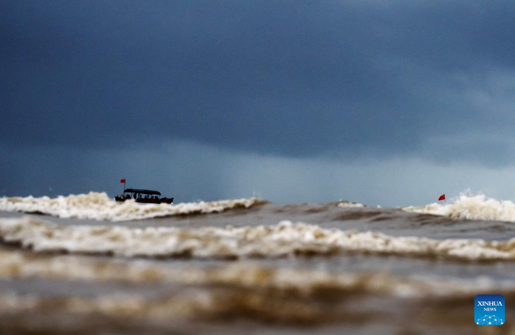 A tourist boat is seen at Jintan beach in Dongxing, south China's Guangxi Zhuang Autonomous Region, Aug. 15, 2023. Jintan beach, which is located in the southern part of the Wanwei Island, has a coastline of 15 kilometers and is named after its golden sand color. (Xinhua/Zhang Ailin)