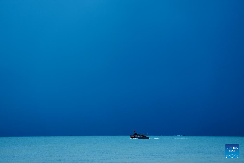 A fishing boat is seen at Jintan beach in Dongxing, south China's Guangxi Zhuang Autonomous Region, Aug. 15, 2023. Jintan beach, which is located in the southern part of the Wanwei Island, has a coastline of 15 kilometers and is named after its golden sand color. (Xinhua/Fei Maohua)