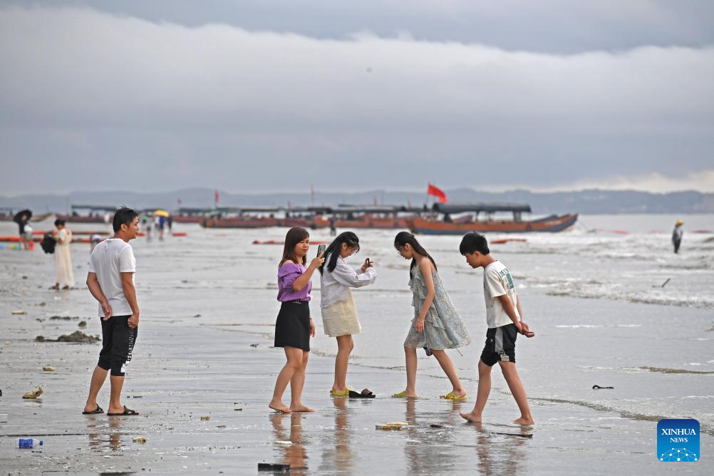 Tourists have fun at Jintan beach in Dongxing, south China's Guangxi Zhuang Autonomous Region, Aug. 15, 2023. Jintan beach, which is located in the southern part of the Wanwei Island, has a coastline of 15 kilometers and is named after its golden sand color. (Xinhua/Zhou Hua)