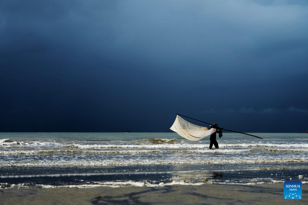 A fisherman is seen at Jintan beach in Dongxing, south China's Guangxi Zhuang Autonomous Region, Aug. 15, 2023. Jintan beach, which is located in the southern part of the Wanwei Island, has a coastline of 15 kilometers and is named after its golden sand color. (Xinhua/Fei Maohua)