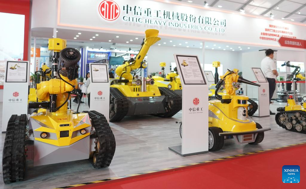 Fire-fighting robots are pictured at the World Robot Conference 2023 in Beijing, capital of China, Aug. 16, 2023. The World Robot Conference 2023 opened here Wednesday, showcasing cutting-edge achievements and the latest robot industry exhibits. (Xinhua/Ren Chao)