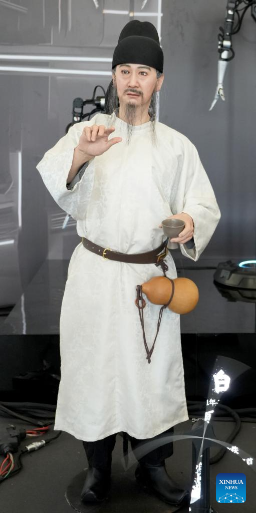 A humanoid robot resembling ancient Chinese poet Li Bai performs at the World Robot Conference 2023 in Beijing, capital of China, Aug. 16, 2023. The World Robot Conference 2023 opened here Wednesday, showcasing cutting-edge achievements and the latest robot industry exhibits. (Xinhua/Wang Yuguo)