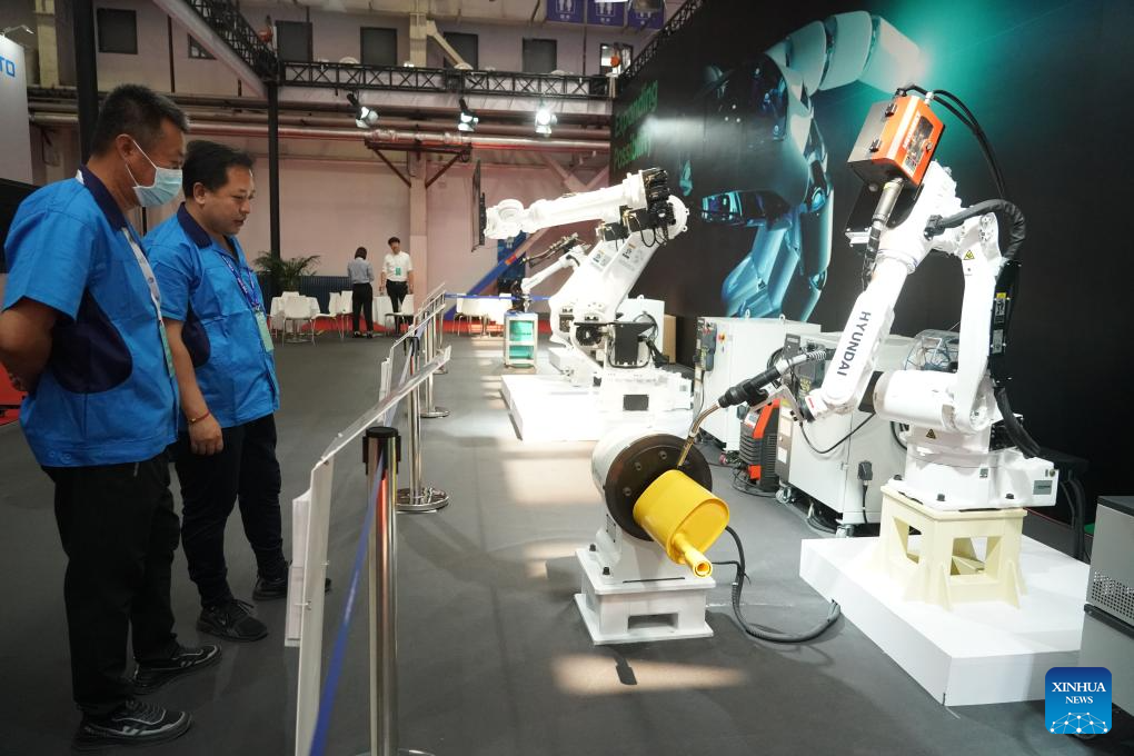 Welding robots are pictured at the World Robot Conference 2023 in Beijing, capital of China, Aug. 16, 2023. The World Robot Conference 2023 opened here Wednesday, showcasing cutting-edge achievements and the latest robot industry exhibits. (Xinhua/Peng Ziyang)