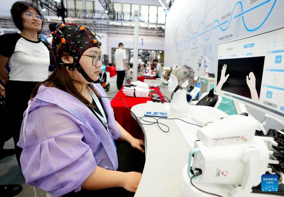 A staff member demonstrates a brain-computer interface for post-stroke rehabilitation at the World Robot Conference 2023 in Beijing, capital of China, Aug. 16, 2023. The World Robot Conference 2023 opened here Wednesday, showcasing cutting-edge achievements and the latest robot industry exhibits. (Xinhua/Wang Yuguo)