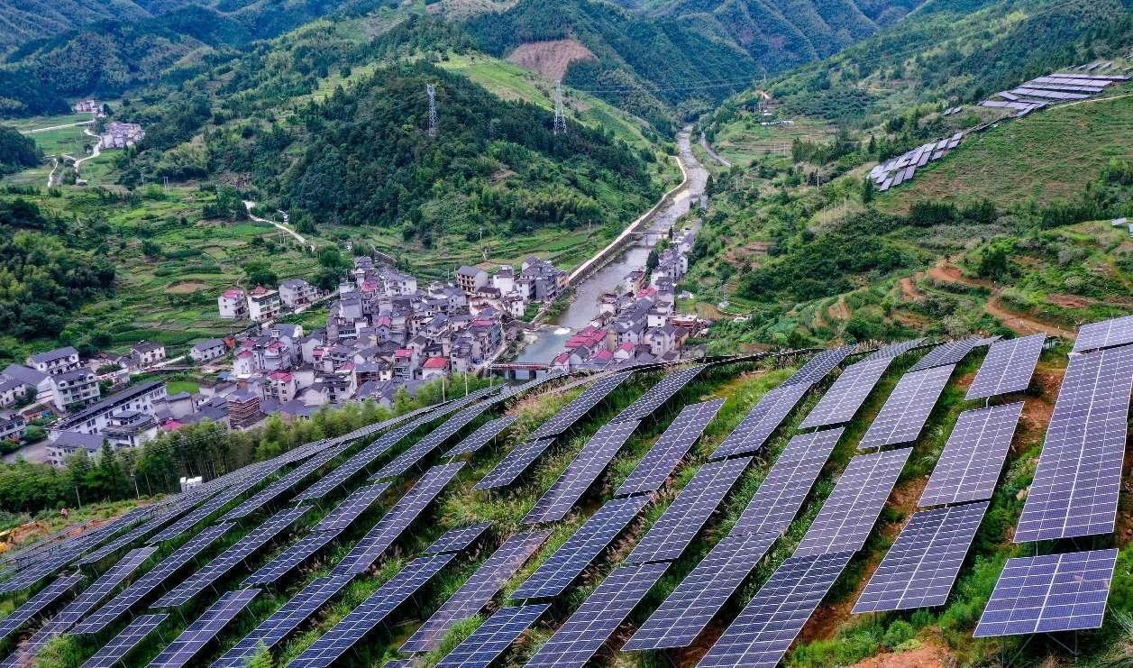 Photo shows a centralized agriculture-complementary photovoltaic power generation project in Zhangcun village, Chun'an county, Hangzhou city, capital of east China's Zhejiang province. (People's Daily Online/Yang Bo)