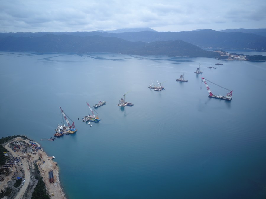 Aerial photo taken on Feb. 1, 2020 shows the construction site of the Peljesac Bridge near Komarna, Croatia. (Xinhua/Gao Lei)