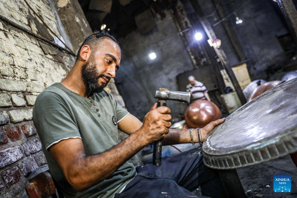 A coppersmith makes a vessel at a workshop in Cairo, Egypt, on Aug. 13, 2023. (Xinhua/Ahmed Gomaa)