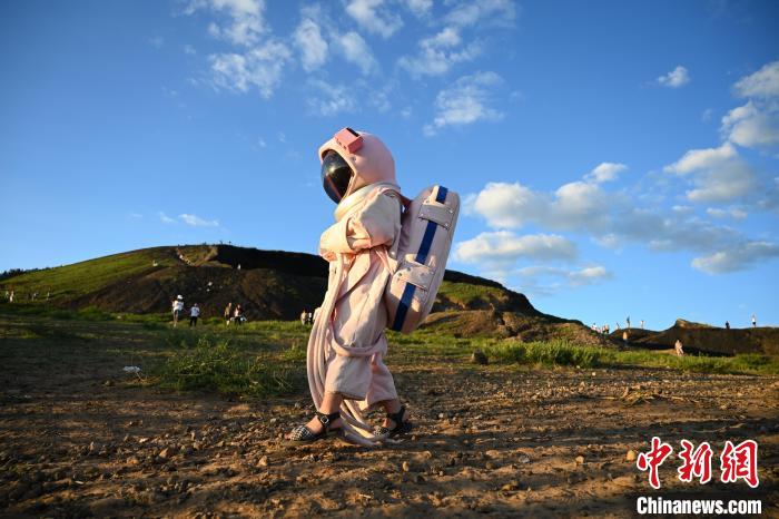 Photo shows a tourist dressed in a "space suit" at the Ulan Hada volcano group in Ulanqab city, north China's Inner Mongolia Autonomous Region. (Chinanews.com/Liu Wenhua)