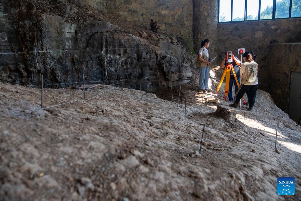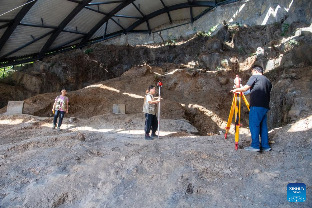 Staff members conduct survey operation at the Longgupo Site in Wushan County, southwest China's Chongqing, on Aug. 16, 2023. Longgupo Site officially started the fifth stage of excavation on Wednesday, and researchers are expected to find more about ancient humans, fossils and related artifacts there. (Xinhua/Tang Yi)