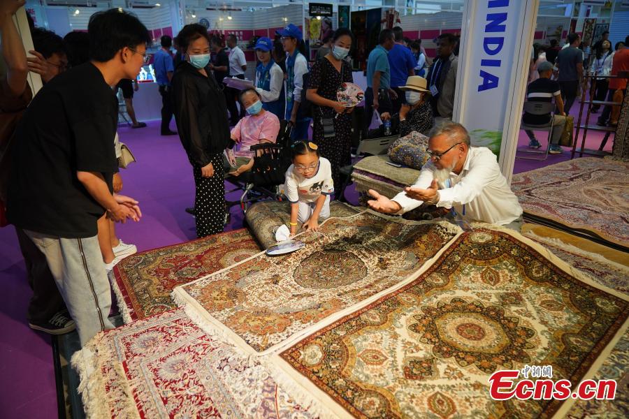 A girl selects a piece of carpet at the seventh China-South Asia Expo in Kunming, southwest China's Yunnan Province, Aug. 16, 2023. (Photo: China News Service/Liu Ranyang)