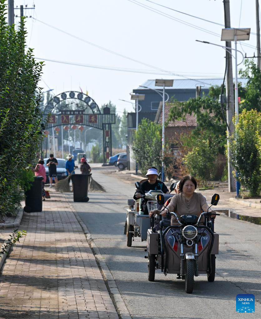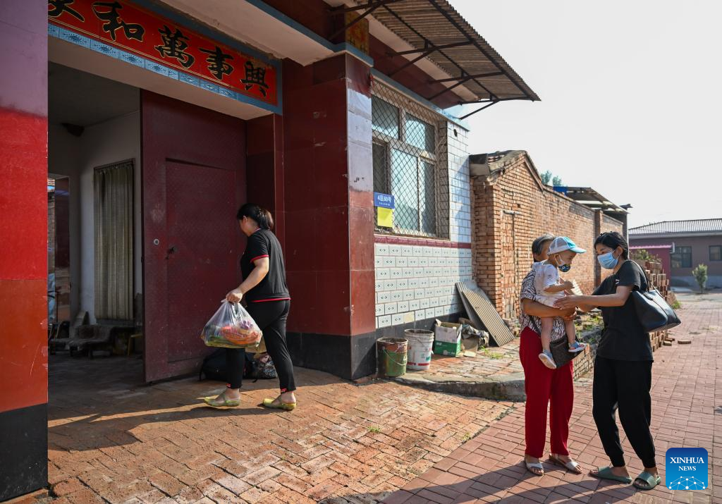 Villagers return home in Shaoqidi Village of Huanghuadian Township, Wuqing District, north China's Tianjin, Aug. 17, 2023. A total of 15,011 people, the last batch of those who were previously relocated from areas prone to flooding by the Yongding River, returned to their homes in 14 villages of Wuqing on Thursday. At present, the power, water, and gas supply have been restored in the villages, and the assessment and reconstruction of damaged facilities are underway in the local areas. (Xinhua/Sun Fanyue)