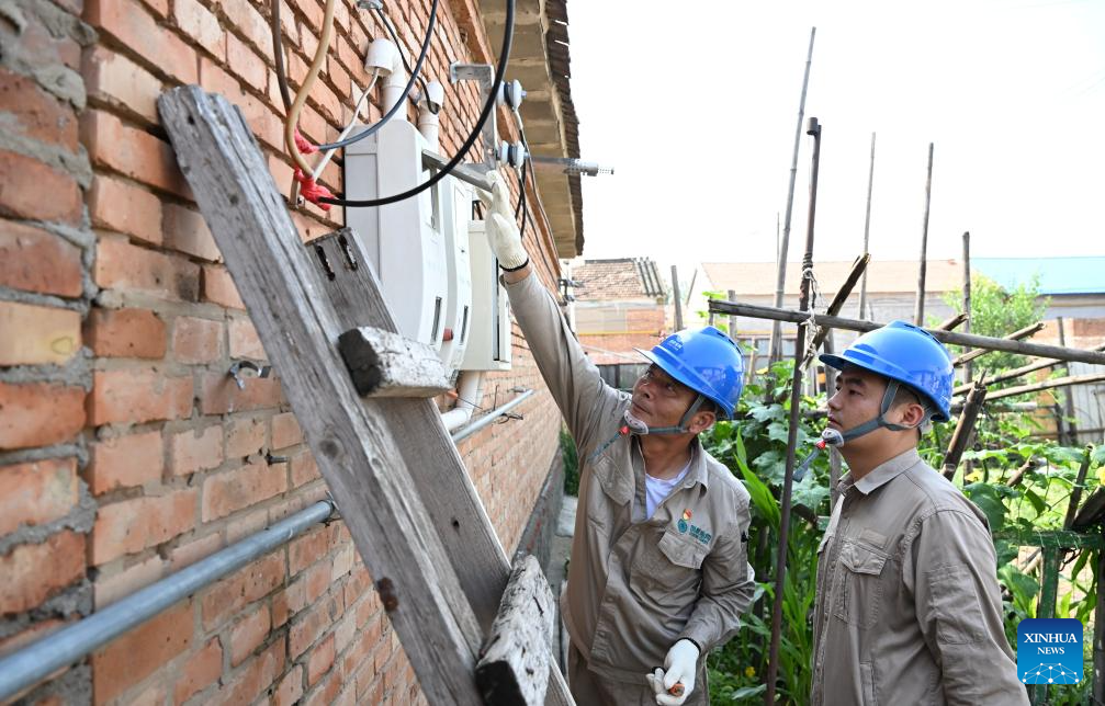 Workers of State Grid Tianjin Electric Power Wuqing Company conduct equipment maintenance work in Shaoqidi Village of Huanghuadian Township, Wuqing District, north China's Tianjin, Aug. 17, 2023. A total of 15,011 people, the last batch of those who were previously relocated from areas prone to flooding by the Yongding River, returned to their homes in 14 villages of Wuqing on Thursday. At present, the power, water, and gas supply have been restored in the villages, and the assessment and reconstruction of damaged facilities are underway in the local areas. (Xinhua/Sun Fanyue)