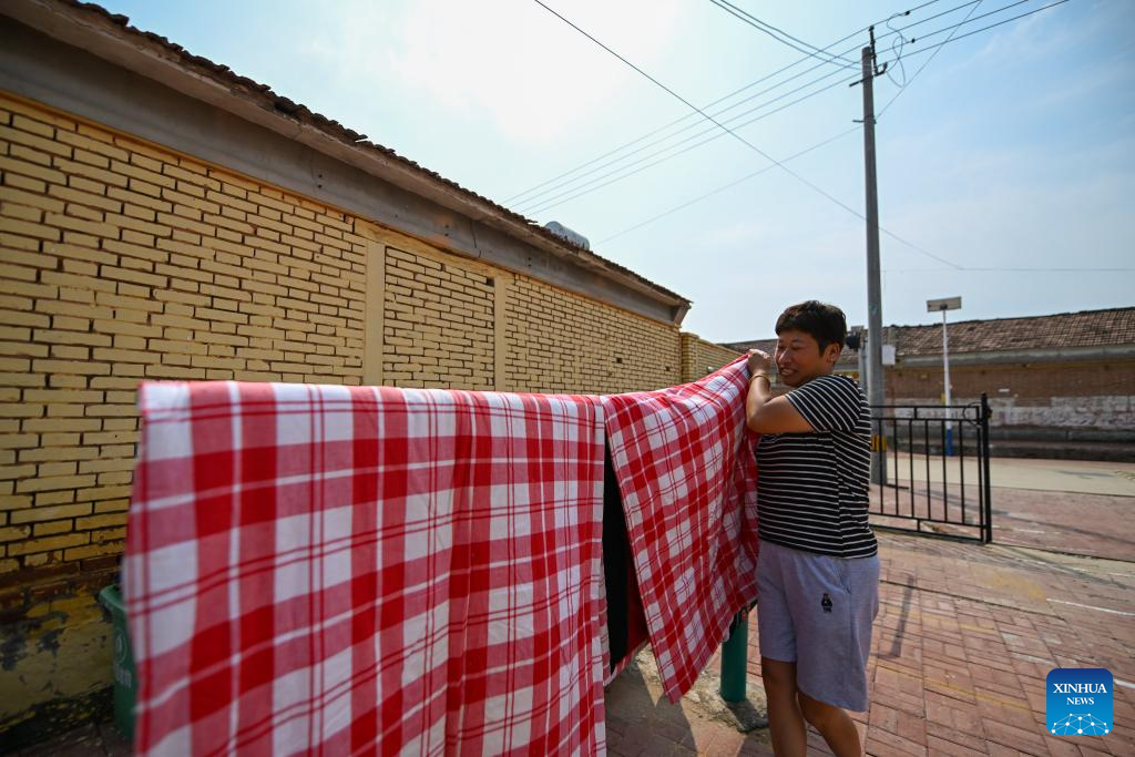 A villager airs the bedding after returning home in Shaoqidi Village of Huanghuadian Township, Wuqing District, north China's Tianjin, Aug. 17, 2023. A total of 15,011 people, the last batch of those who were previously relocated from areas prone to flooding by the Yongding River, returned to their homes in 14 villages of Wuqing on Thursday. At present, the power, water, and gas supply have been restored in the villages, and the assessment and reconstruction of damaged facilities are underway in the local areas. (Xinhua/Sun Fanyue)